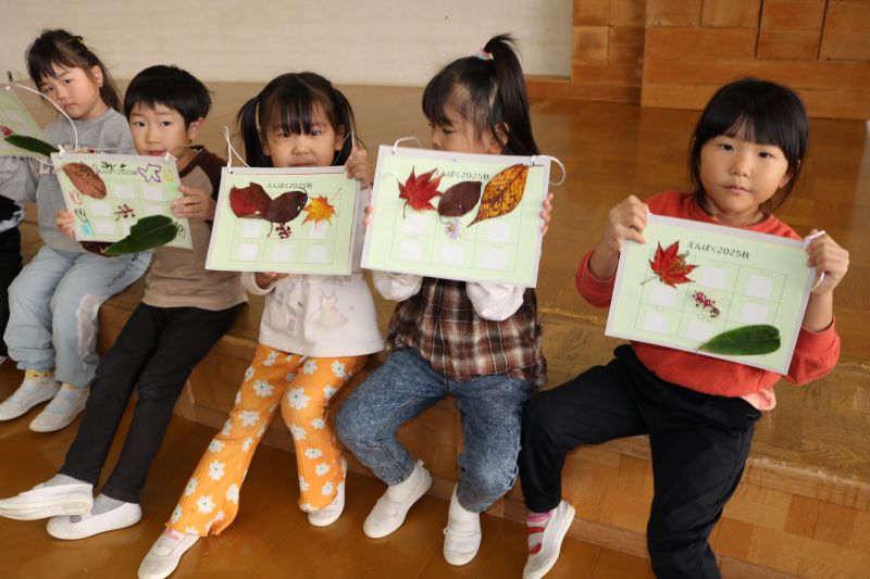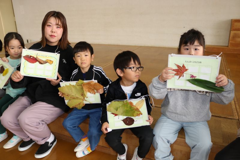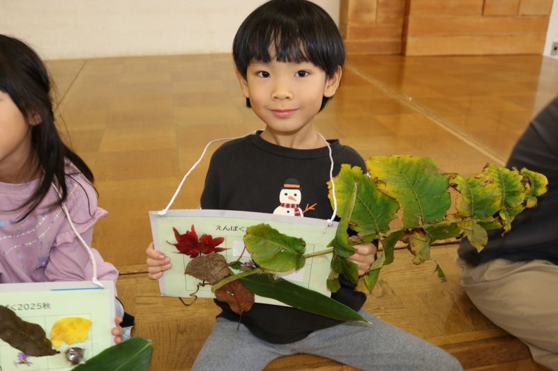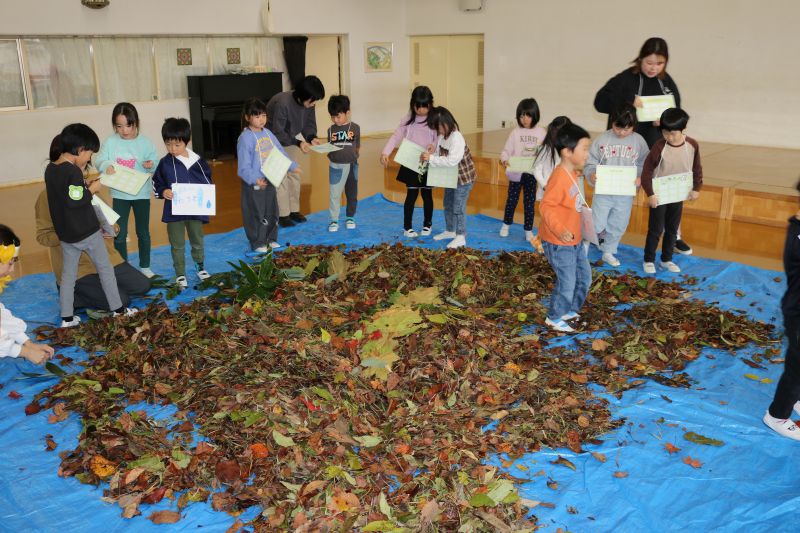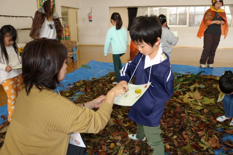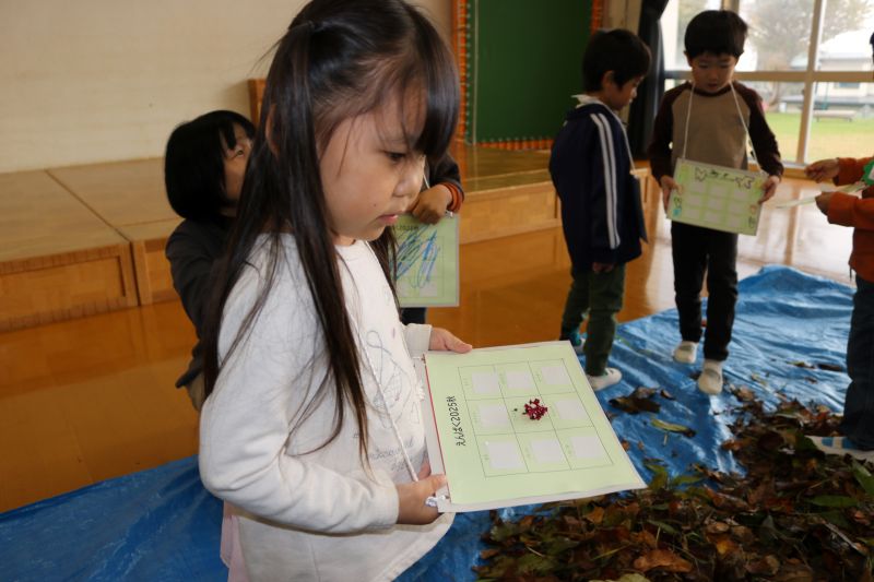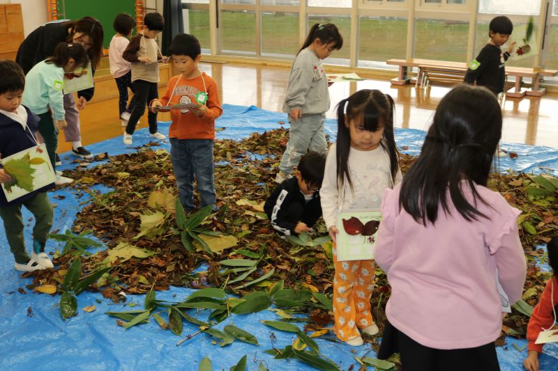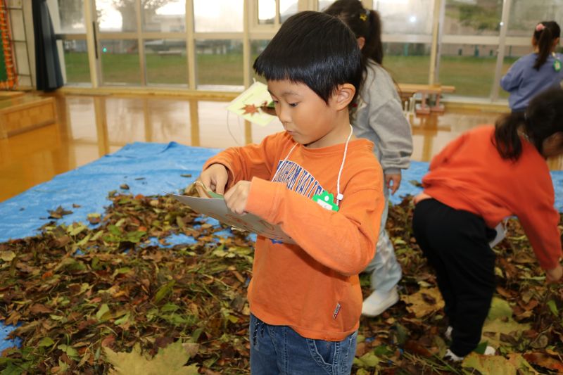 「きいろ」「すべすべ」など書いている言葉に合わせて葉っぱを探します。