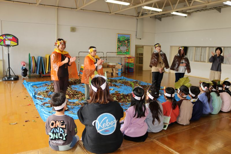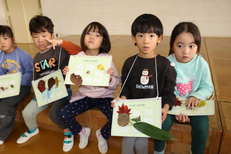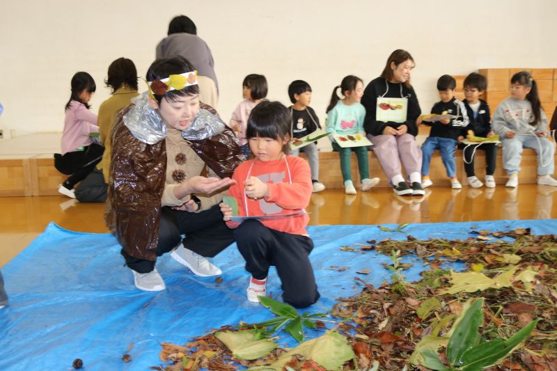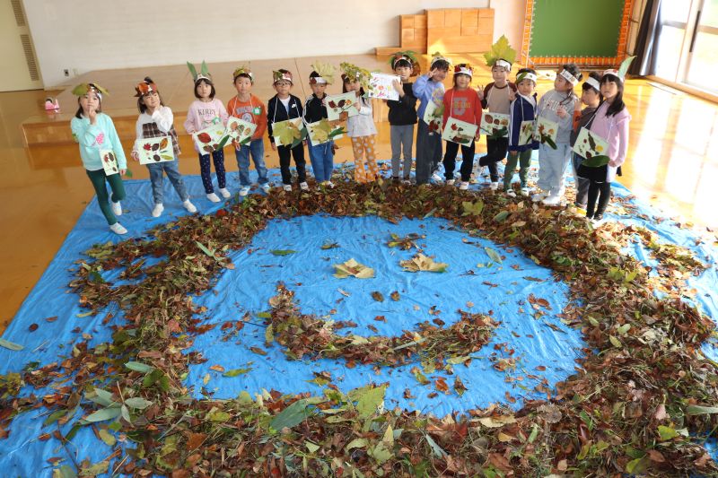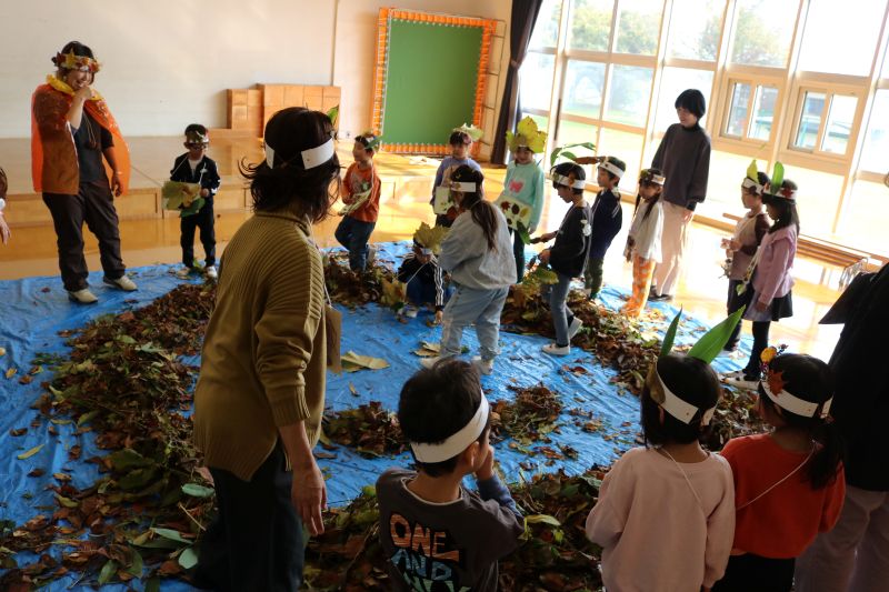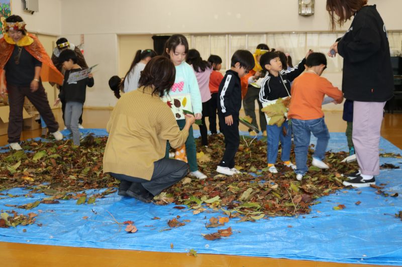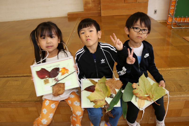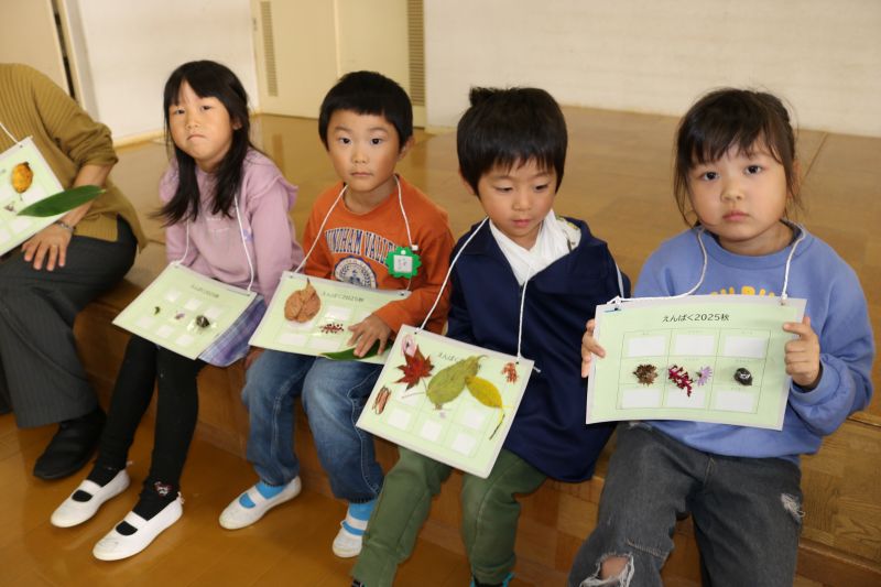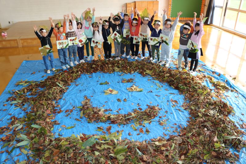 「きいろ」「すべすべ」など書いている言葉に合わせて葉っぱを探します。