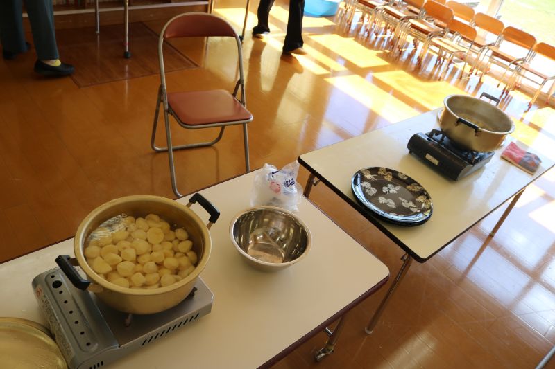 収穫したジャガイモ茹でのお手伝いいただきます。
